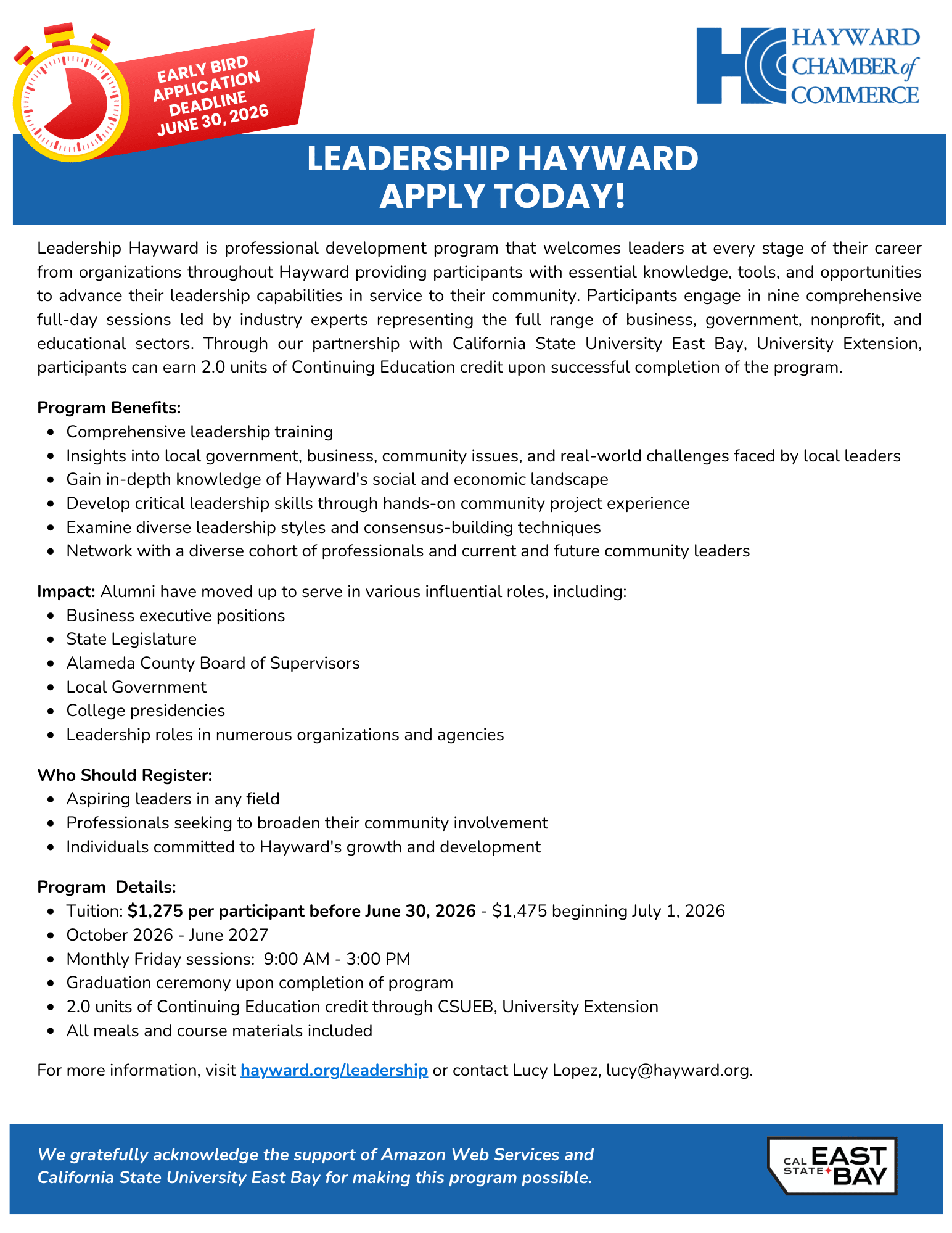 Thanks to our partners California State University East Bay, we are able to offer Leadership Hayward at a more competitive rate compared to similar programs in other cities. Their underwriting helps us maintain high-quality programming while keeping costs accessible for participants.